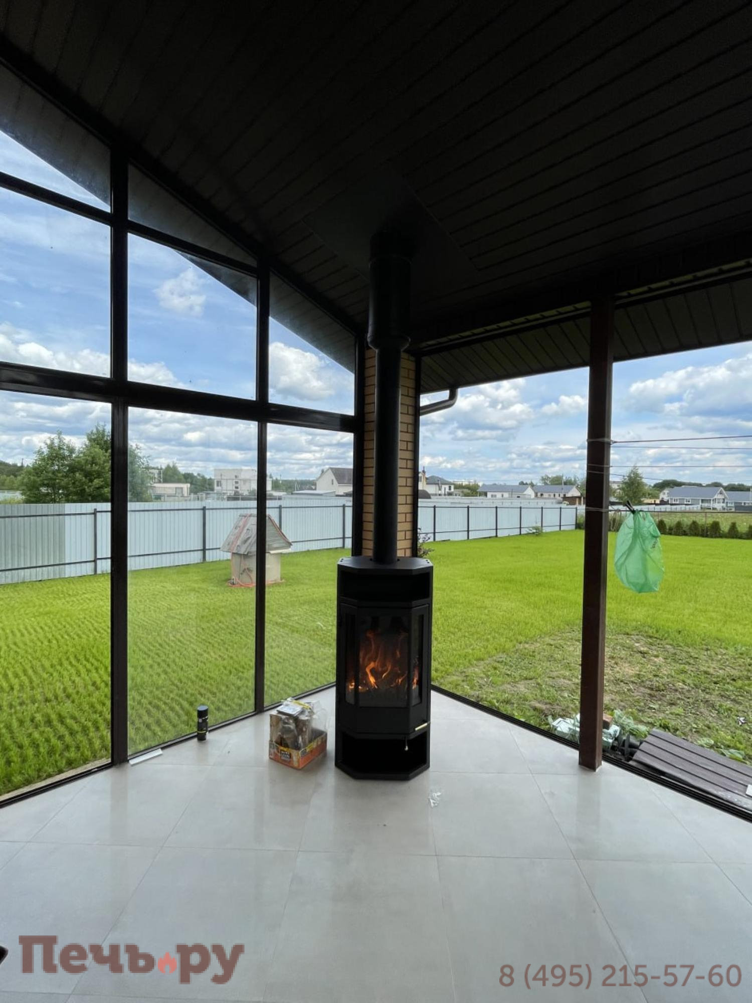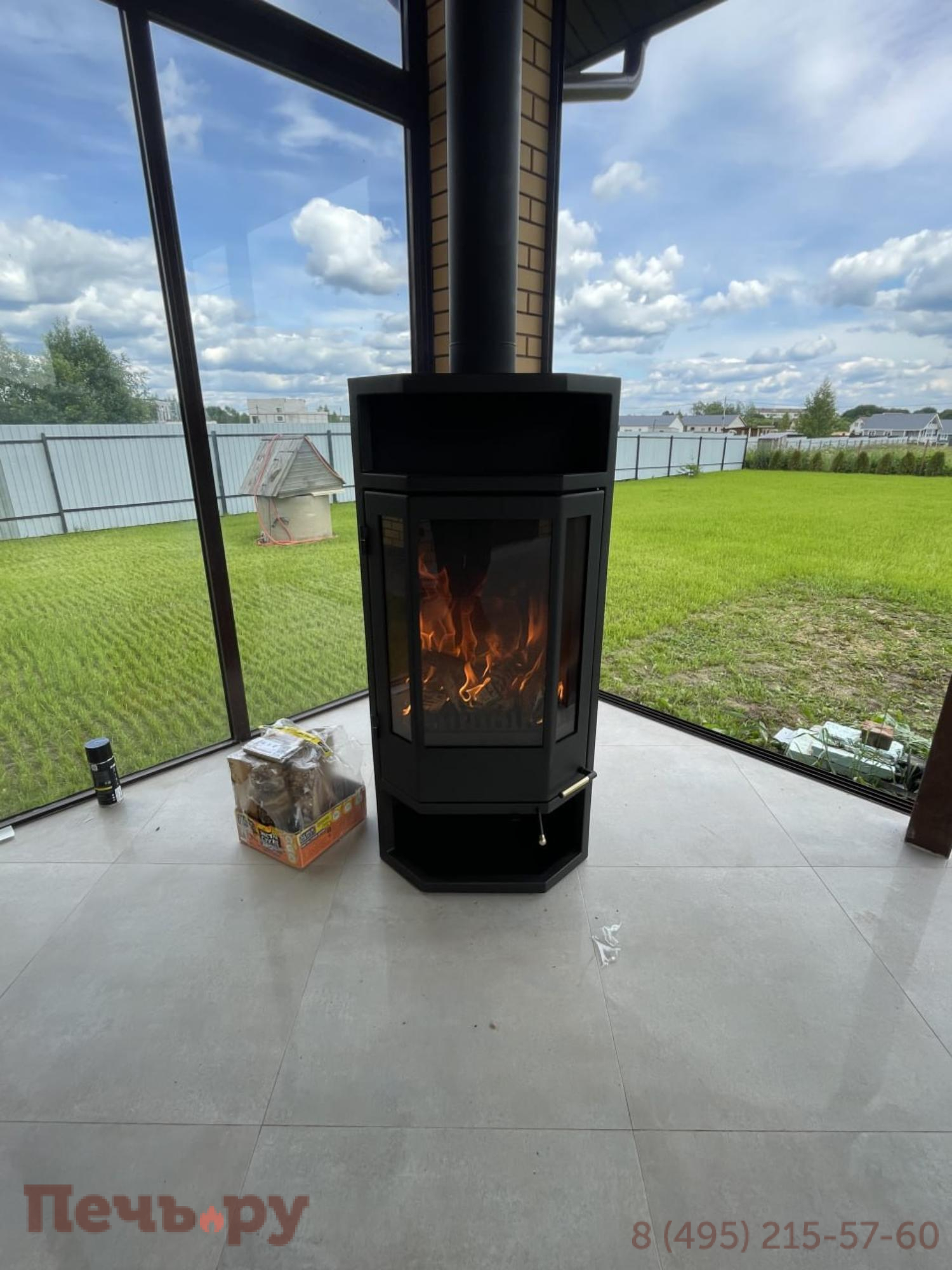 Печь призматической формы, два вида облицовки. Вторичный дожиг, чистое стекло, подача воздуха извне.